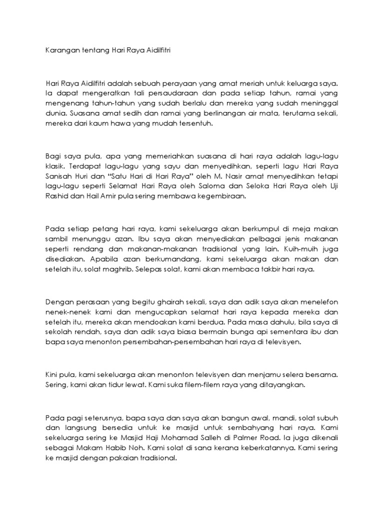Moment tersebut berada di tanggal 1 syawal pada penanggalan hijriyah berhubungan dengan acara peringatan hari besar islam tersebut. Karangan Hari Raya Aidilfitri - Spm Bahasa. Selesai solat subuh keesokan harinya kami terus bertolak ke kampung nenek di Batu Pahat Johor.